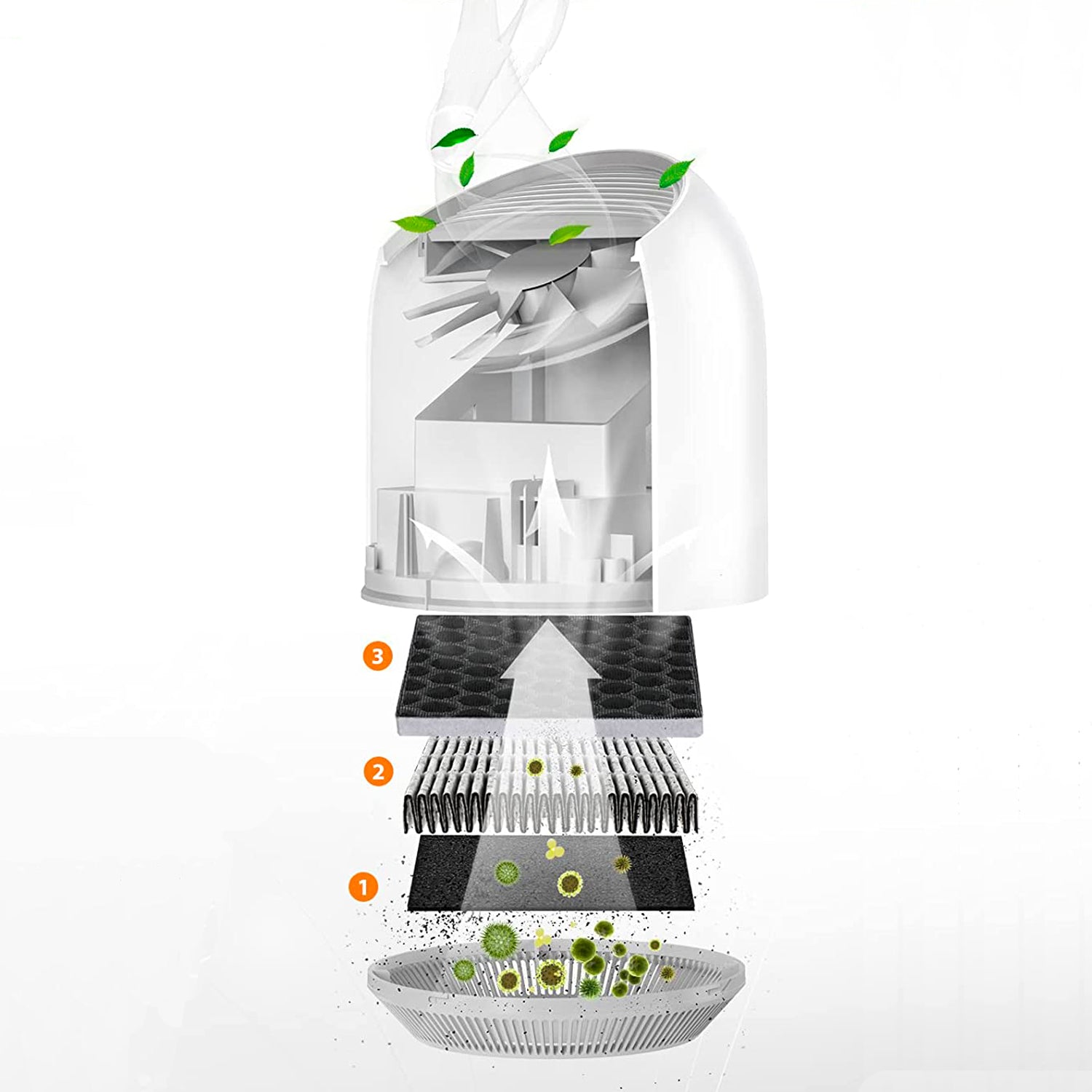 Home Haven Air Purifier, equipped with our strong HEPA and carbon filters, removes particles as small as 0.1um and protects against viruses, bacteria, dust, fine particles, smoke, and bad odors.